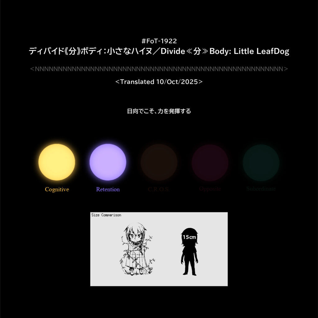 #FoT-1922:ディバイド《分》ボディ:小さなハイヌ/Divide≪分≫Body: Little LeafDog カテゴリー: 1900-1999 日向でこそ、力を発揮する X–N–X X–N–X ↡Shareable #1920-1929#葉狗型 2025年10月10日