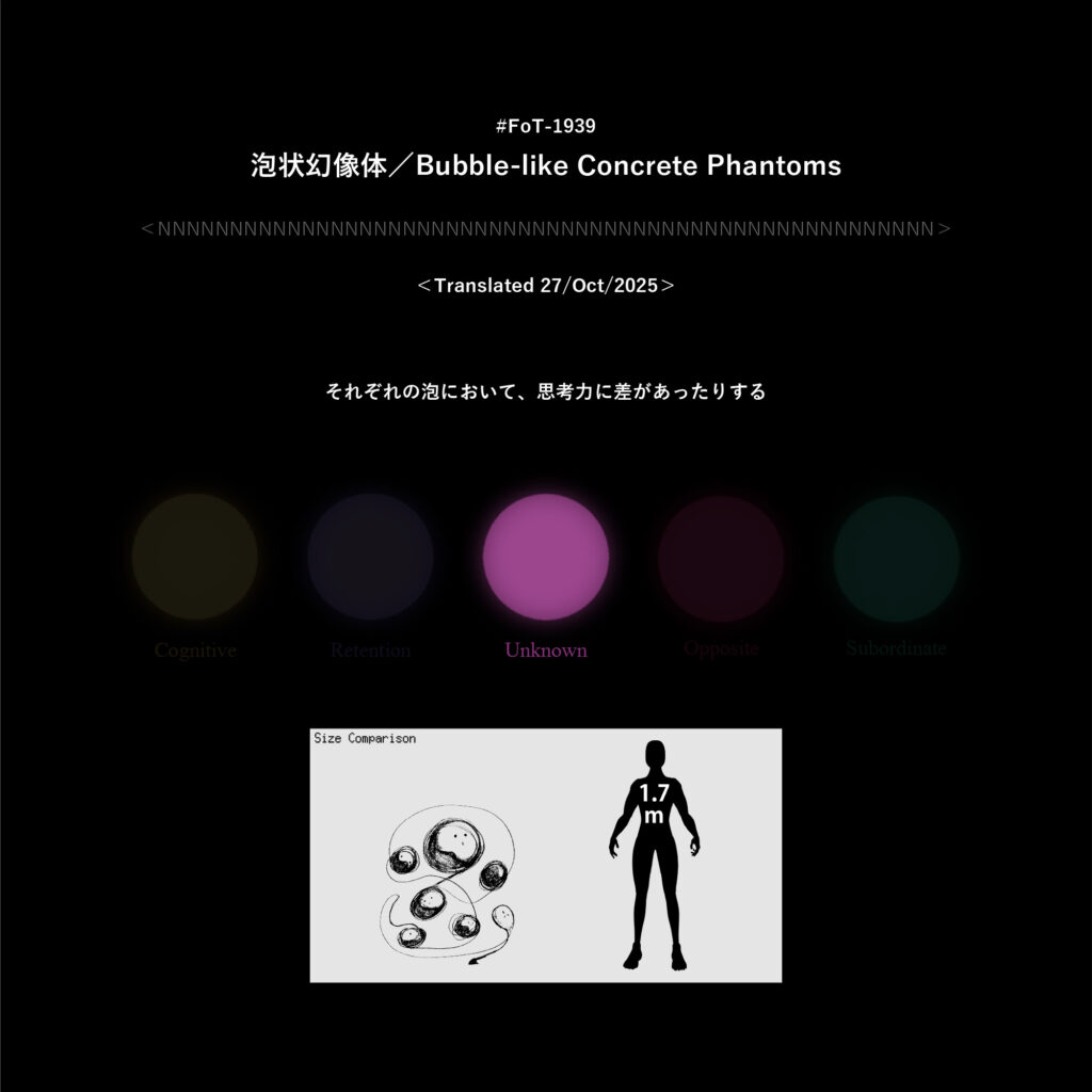#FoT-1939:泡状幻像体ほうじょうげんぞうたい/Bubble-like Concrete Phantoms カテゴリー: 1900-1999 それぞれの泡において、思考力に差があったりする X–N–X X–N–X ↡Shareable #1930-1939 2025年10月27日