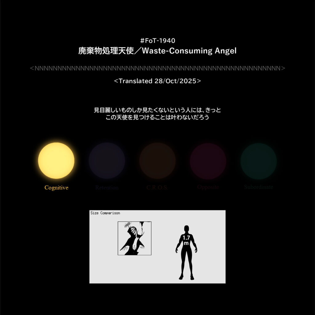 #FoT-1940:廃棄物処理天使/Waste-Consuming Angel カテゴリー: 1900-1999 見目麗しいものしか見たくないという人には、きっとこの天使を見つけることは叶わないだろう X–N–X X–N–X ↡Shareable #1940-1949 2025年10月28日
