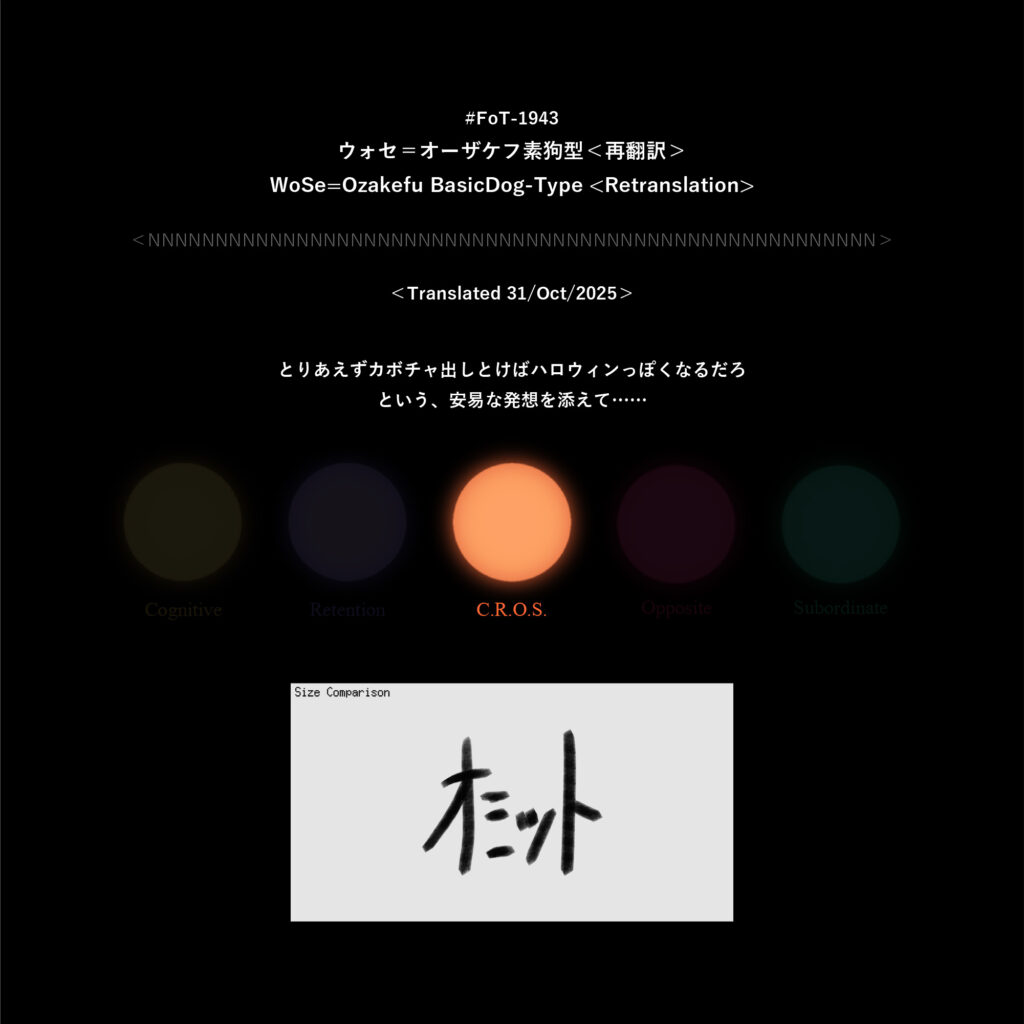 #FoT-1942:ウォセ=オーザケフ素狗型<再翻訳>/WoSe=Ozakefu BasicDog-Type<Retranslation> カテゴリー: 1900-1999 とりあえずカボチャ出しとけばハロウィンっぽくなるだろという、安易な発想を添えて…… X–N–X X–N–X ↡Shareable #1940-1949#素狗型 2025年10月31日