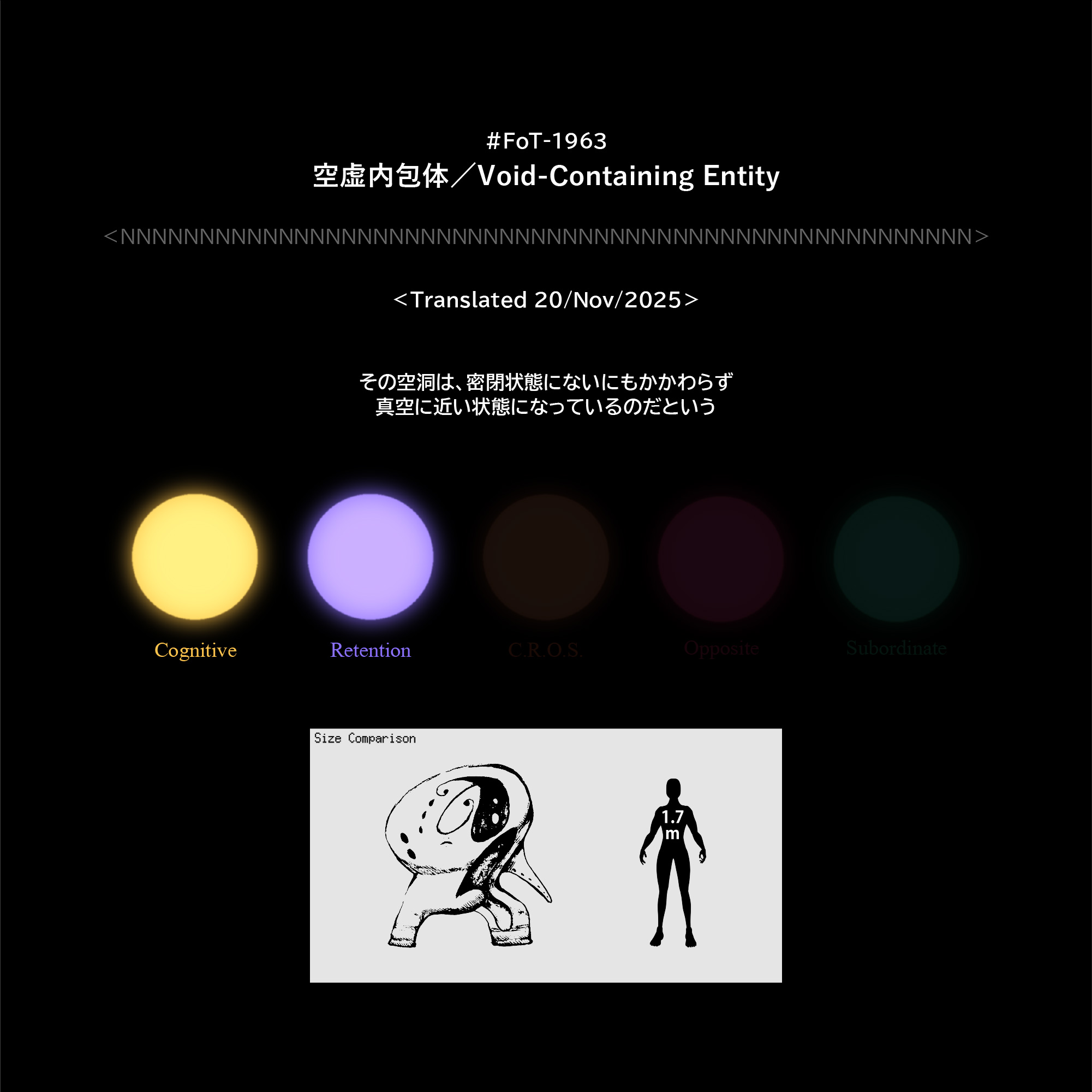 #FoT-1963:空虚内包体/Void-Containing Entity カテゴリー: 1900-1999 その空洞は、密閉状態にないにもかかわらず真空に近い状態になっているのだという X–N–X X–N–X ↡Shareable #1960-1969 2025年11月20日