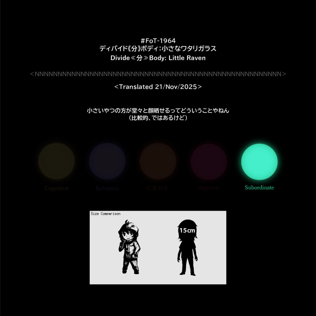 #FoT-1964:ディバイド《分》ボディ:小さなワタリガラス/Divide≪分≫Body: Little Raven カテゴリー: 1900-1999 小さいやつの方が堂々と顔晒せるってどういうことやねん(比較的、ではあるけど) X–N–X X–N–X ↡Shareable #1960-1969#渡型 2025年11月21日