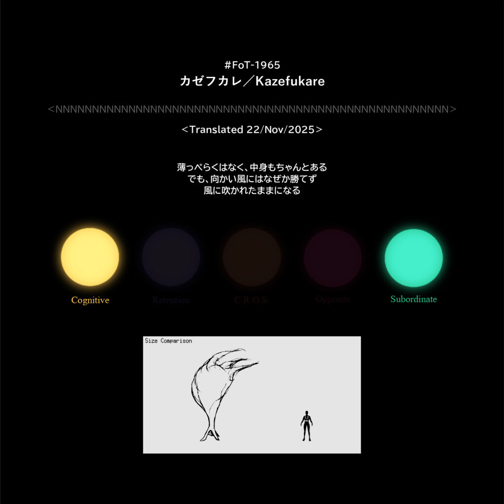 #FoT-1965:カゼフカレ/Kazefukare カテゴリー: 1900-1999 薄っぺらくはなく、中身もちゃんとあるでも、向かい風にはなぜか勝てず風に吹かれたままになる X–N–X X–N–X ↡Shareable #1960-1969 2025年11月22日