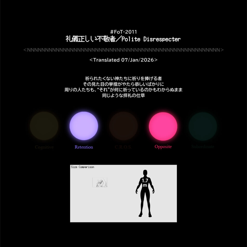 #FoT-2011:礼儀正しい不敬者/Polite Disrespecter カテゴリー: 2000-2099, 2000-2999 祈られたくない神たちに祈りを捧げる者その見た目の挙措がやたら恭しいばかりに周りの人たちも、“それ”が何に祈っているのかもわからぬまま同じような拝礼の仕草 X–N–X X–N–X ↡Shareable #2010-2019 2026年1月7日