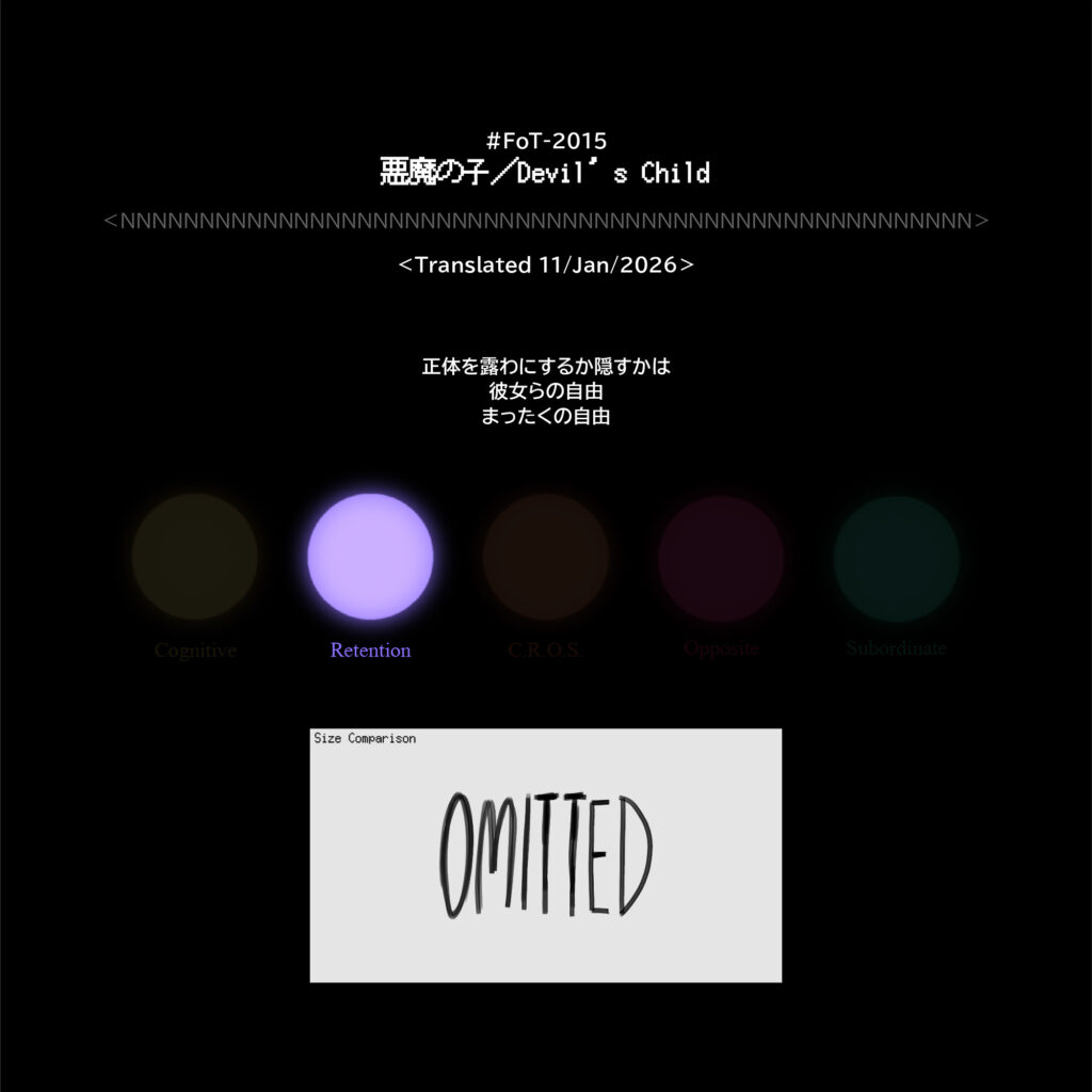 #FoT-2015:悪魔の子/Devil’s Child カテゴリー: 2000-2099, 2000-2999 正体を露あらわにするか隠すかは彼女らの自由まったくの自由 X–N–X X–N–X ↡Shareable #2010-2019#暗狗型 2026年1月11日