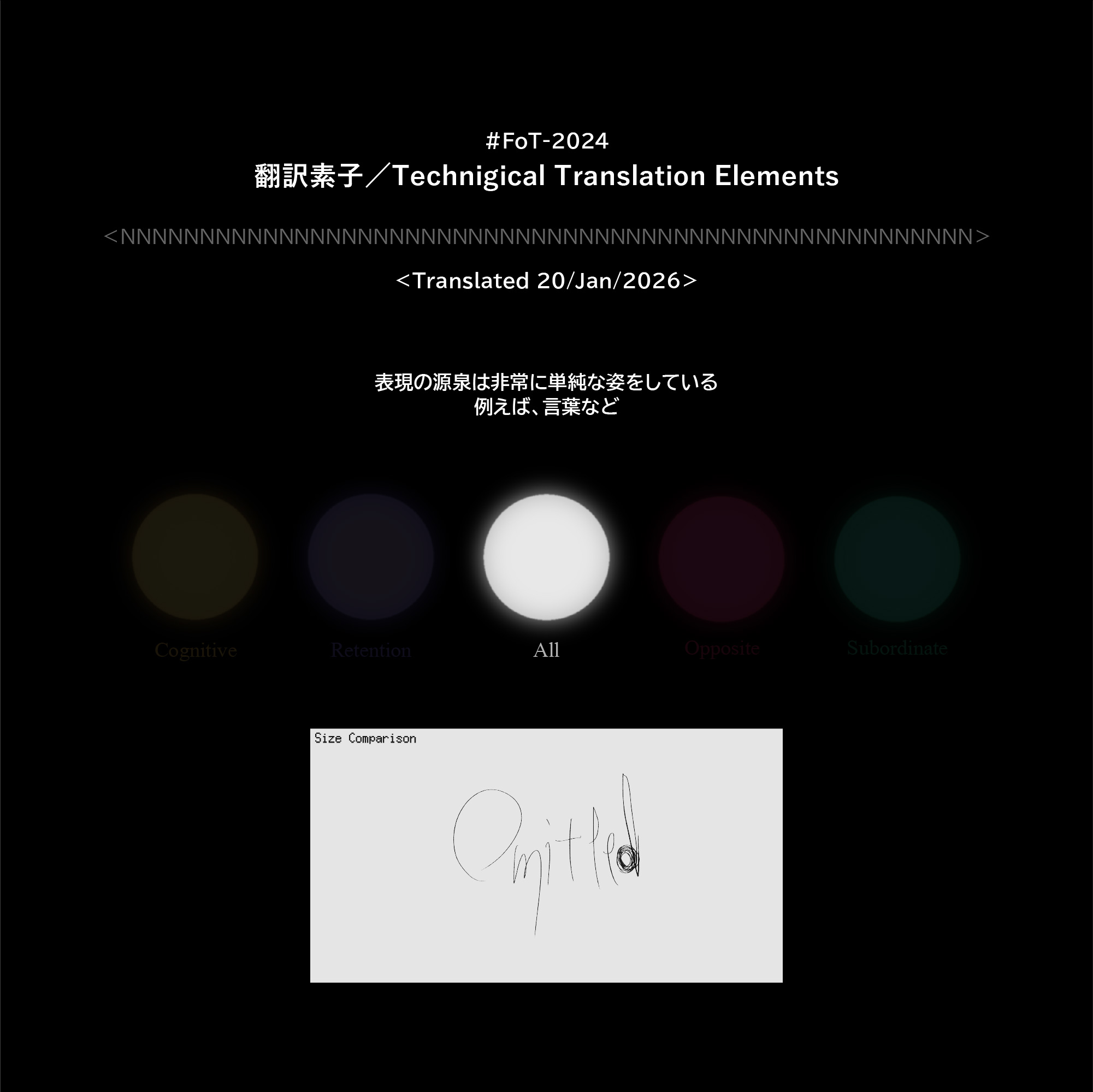 #FoT-2024:翻訳素子ほんやくそし/Technigical Translation Elements カテゴリー: 2000-2099, 2000-2999 表現の源泉は非常に単純な姿をしている例えば、言葉など X–N–X X–N–X ↡Shareable #2020-2029 2026年1月20日