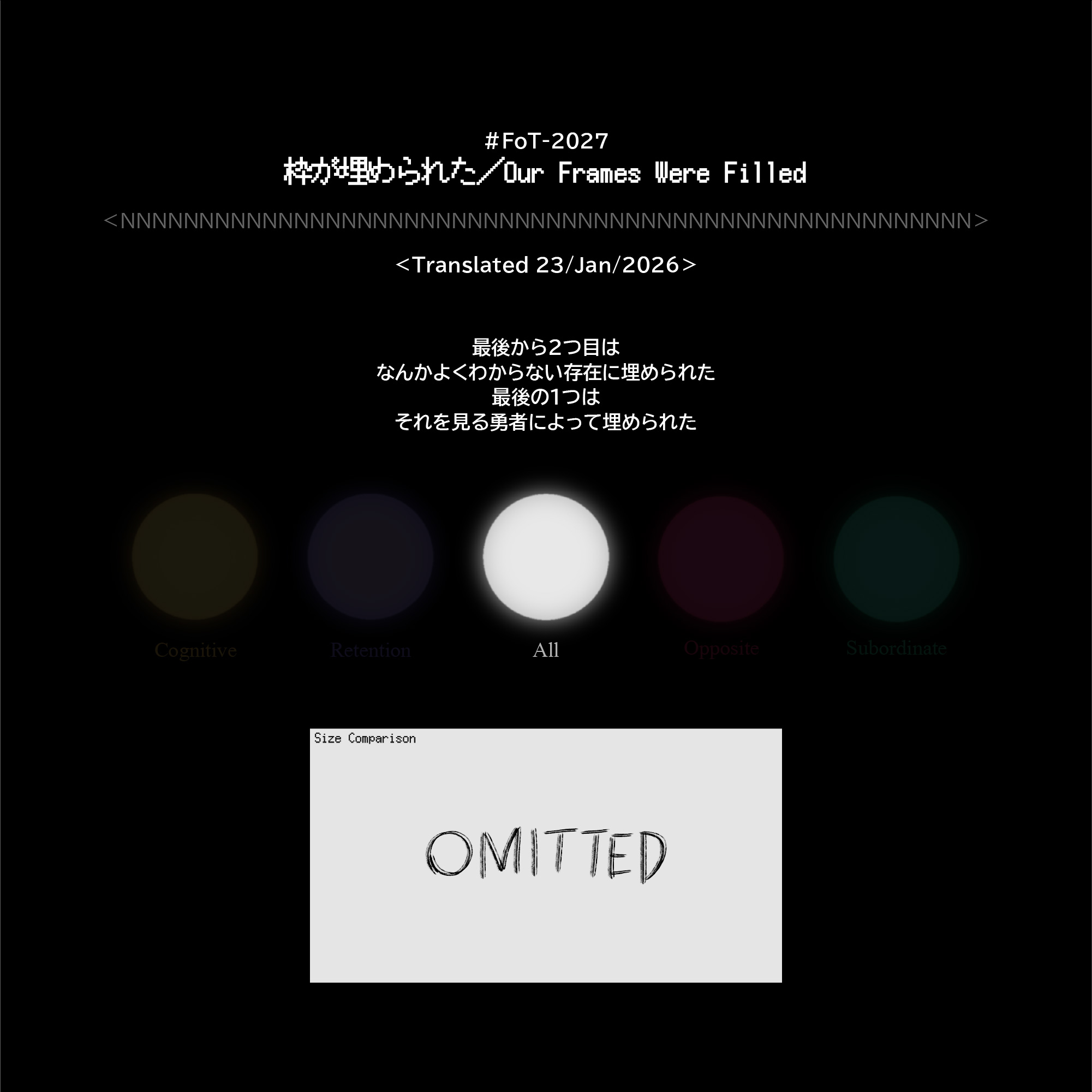 #FoT-2027:枠が埋められた/Our Frames Were Filled カテゴリー: 2000-2099, 2000-2999 最後から2つ目はなんかよくわからない存在に埋められた最後の1つはそれを見る勇者によって埋められた X–N–X X–N–X ↡Shareable #2020-2029#花狗型 2026年1月23日
