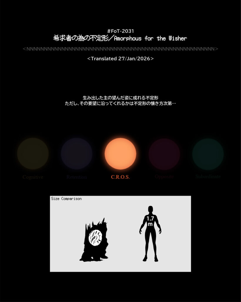 #FoT-2031:希求者の為の不定形/Amorphous for the Wisher カテゴリー: 2000-2099, 2000-2999 生み出した主の望んだ姿に成れる不定形ただし、その要望に沿ってくれるかは不定形の懐き方次第… X–N–X X–N–X ↡Shareable #2030-2039 2026年1月27日