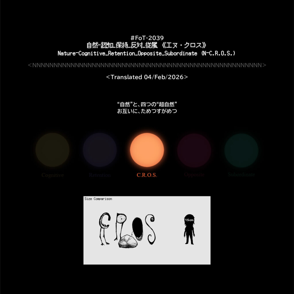 #FoT-2039:自然-認知_保持_反対_従属エヌ・クロス/Nature-Cognitive_Retention_Opposite_SubordinateN-C.R.O.S. カテゴリー: 2000-2099, 2000-2999 “自然”と、四つの“超自然”お互いに、ためつすがめつ X–N–X X–N–X ↡Shareable #2030-2039 2026年2月4日