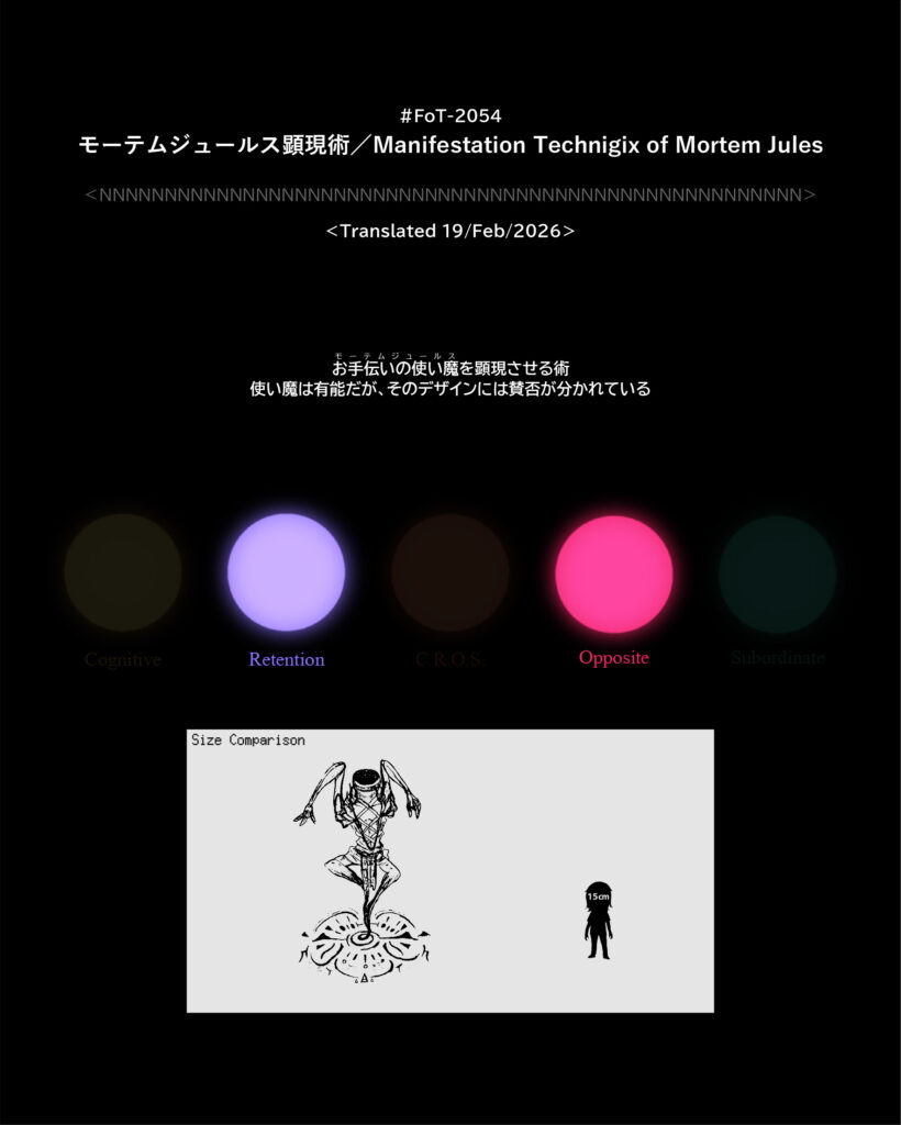 #FoT-2054:モーテムジュールス顕現術/Manifestation Technigix of Mortem Jules カテゴリー: 2000-2099 お手伝いの使い魔モーテムジュールスを顕現させる術使い魔は有能だが、そのデザインには賛否が分かれている X–N–X X–N–X ↡Shareable #2050-2059 2026年2月19日