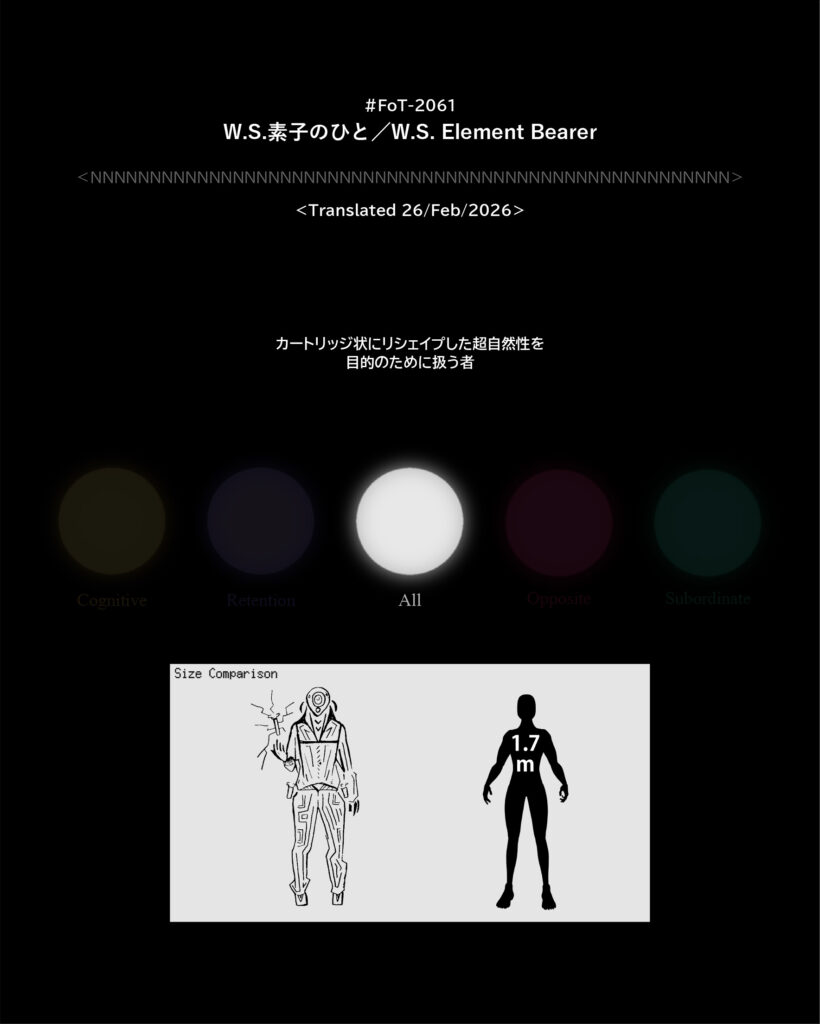 #FoT-2061:W.S.素子そしのひと/W.S. Element Bearer カテゴリー: 2000-2099 カートリッジ状にリシェイプした超自然性を目的のために扱う者 X–N–X X–N–X ↡Shareable #2060-2069 2026年2月26日