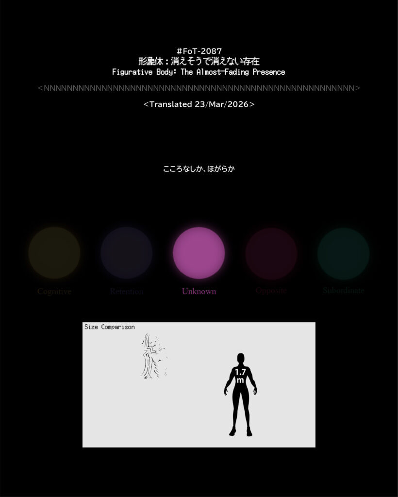 #FoT-2087:形象体:消えそうで消えない存在/Figurative Body: The Almost-Fading Presence カテゴリー: 2000-2099 こころなしか、ほがらか X–N–X X–N–X ↡Shareable #2080-2089 2026年3月24日