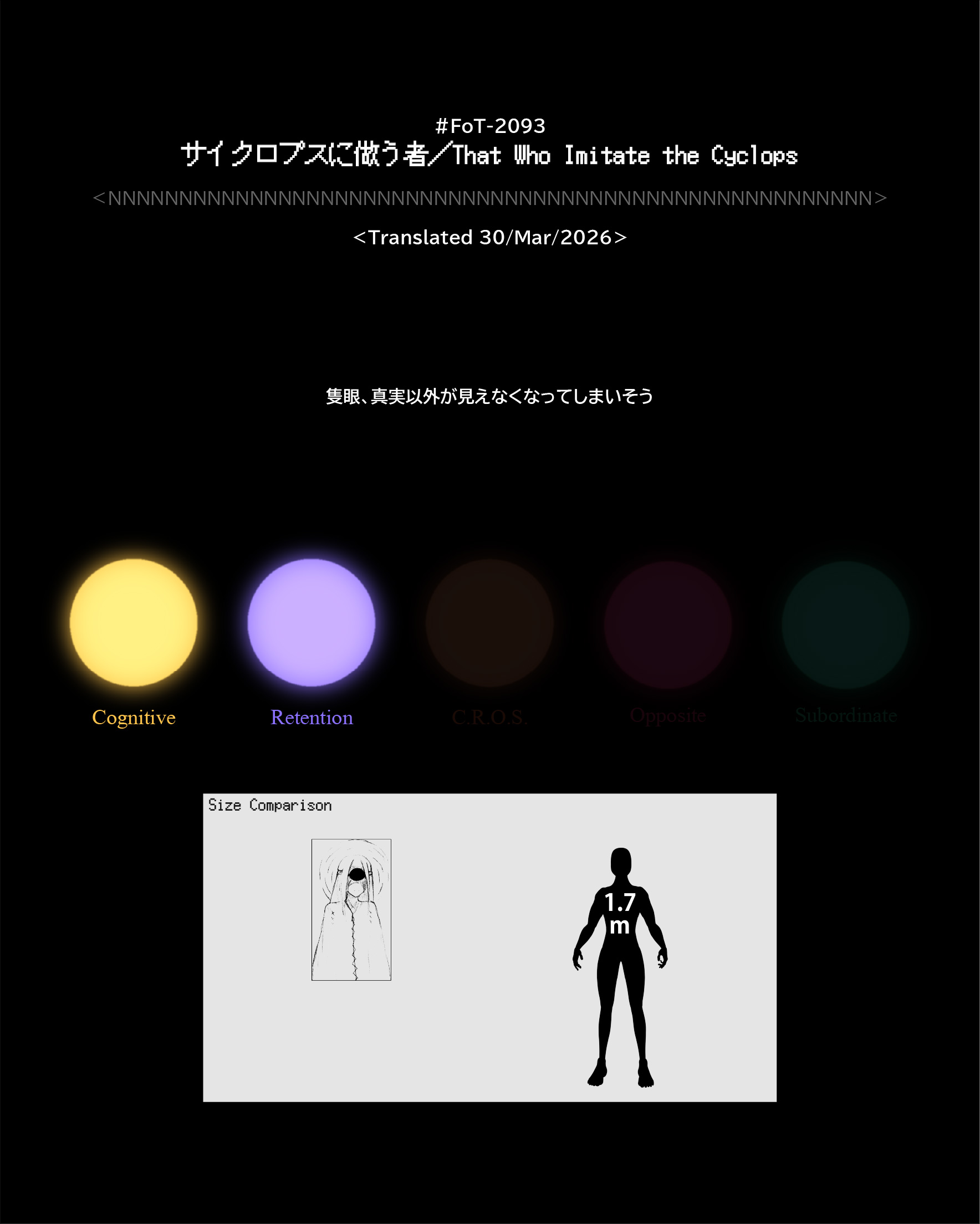 #FoT-2093:サイクロプスに倣う者/That Who Imitate the Cyclops カテゴリー: 2000-2099 隻眼せきがん、真実以外が見えなくなってしまいそう X–N–X X–N–X ↡Shareable #2090-2099 2026年3月30日