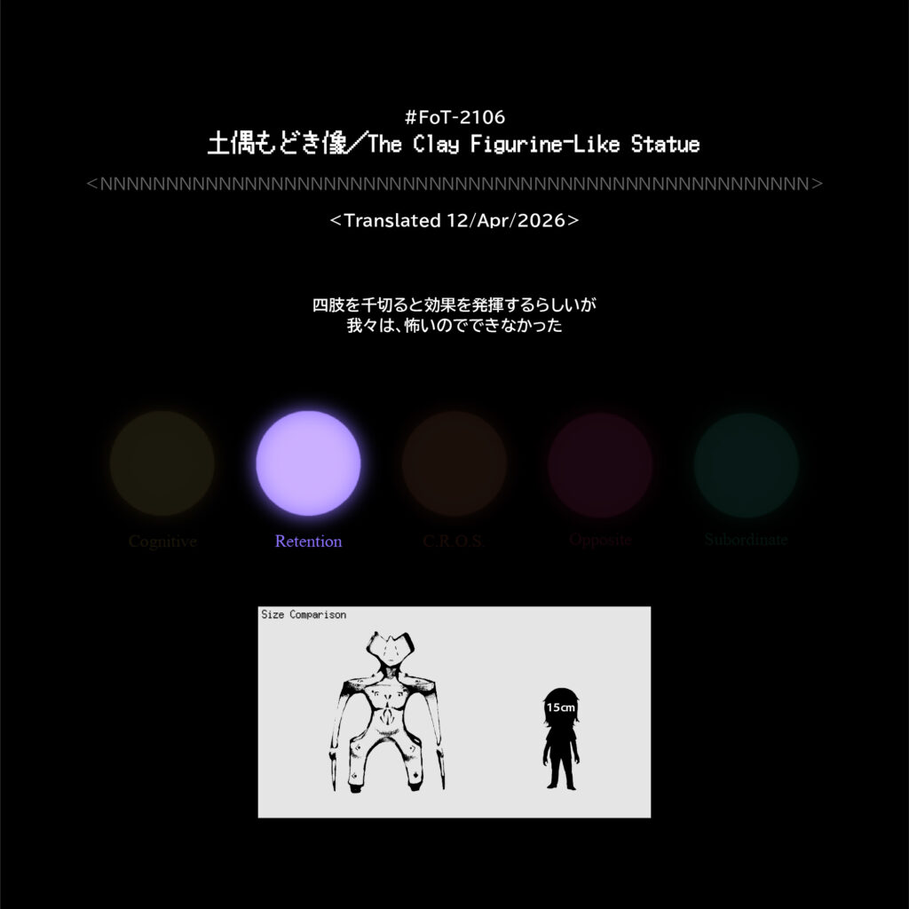#FoT-2106:土偶もどき像/The Clay Figurine-Like Statue カテゴリー: 2100-2199 四肢を千切ると効果を発揮するらしいが我々は、怖いのでできなかった X–N–X X–N–X ↡Shareable #2100-2109 2026年4月12日