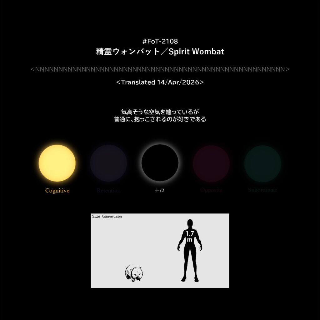 #FoT-2108:精霊ウォンバット/Spirit Wombat カテゴリー: 2100-2199 気高そうな空気を纏っているが普通に、抱っこされるのが好きである X–N–X X–N–X ↡Shareable #2100-2109 2026年4月14日