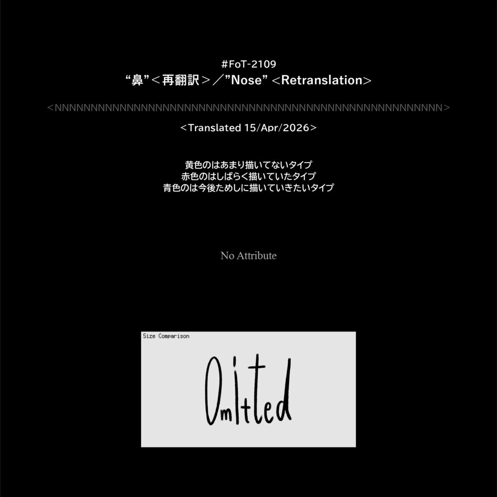 #FoT-2109:”鼻”<再翻訳>/”Nose”<Retranslation> カテゴリー: 2100-2199 黄色のはあまり描いてないタイプ赤色のはしばらく描いていたタイプ青色のは今後ためしに描いていきたいタイプ X–N–X X–N–X ↡Shareable #2100-2109#狐型 2026年4月15日