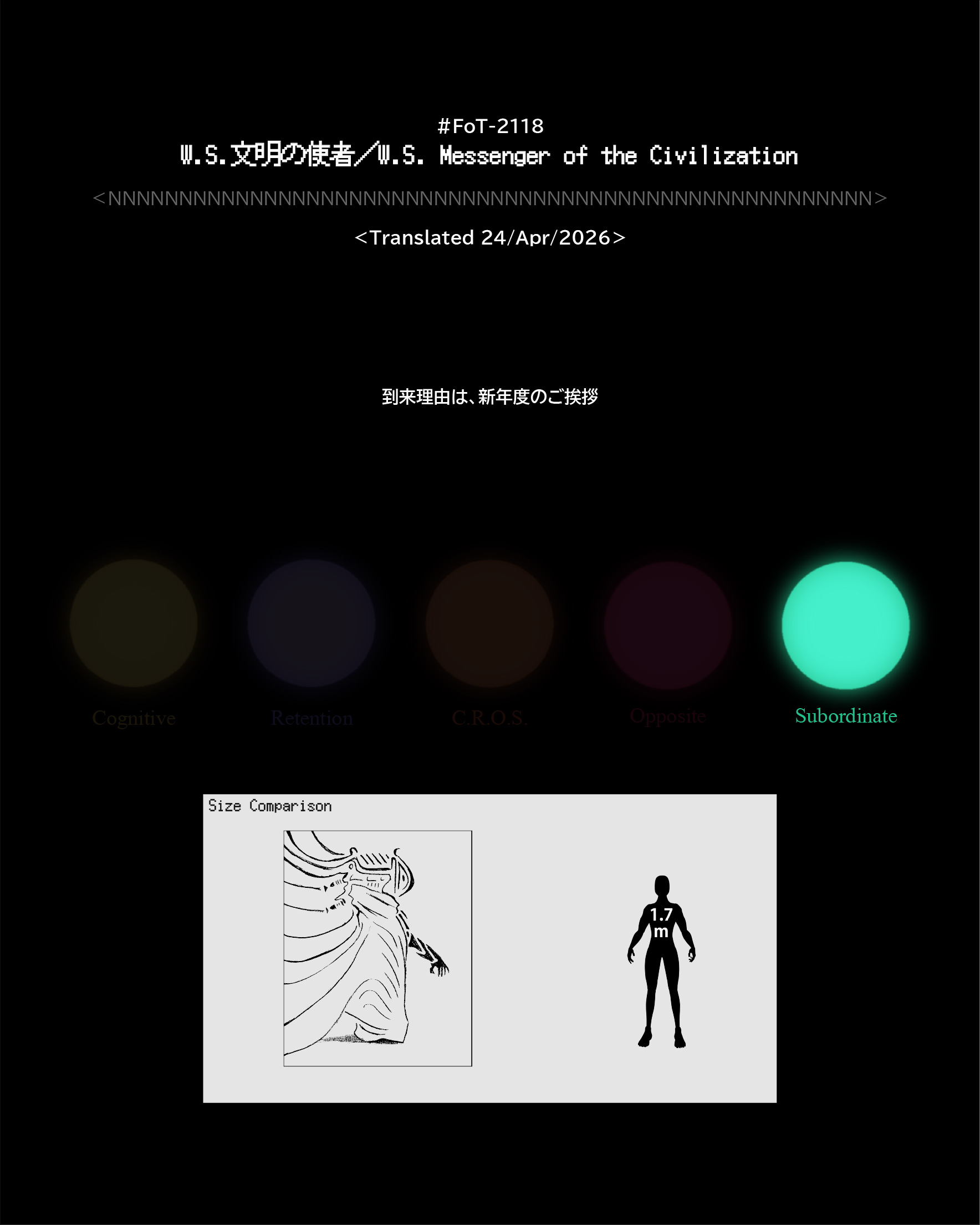 #FoT-2118:W.S.文明の使者/W.S. Messenger of the Civilization カテゴリー: 2100-2199 到来理由は、新年度のご挨拶 X–N–X X–N–X ↡Shareable #2110-2119 2026年4月24日